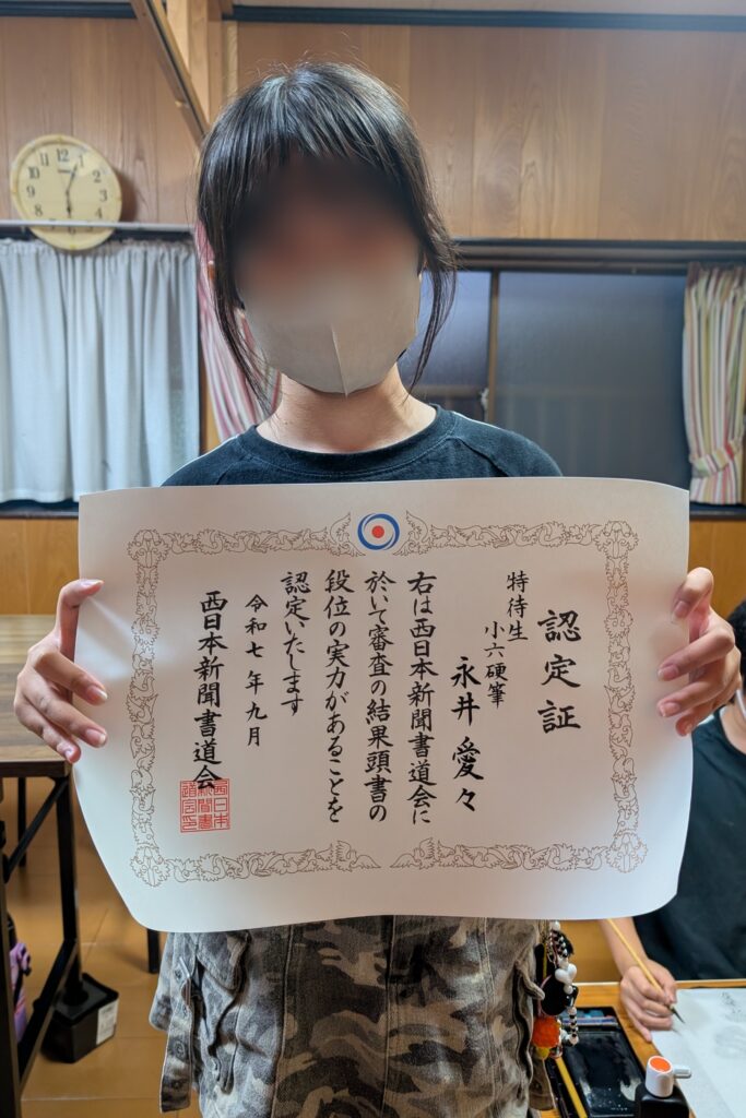 この度、西日本新聞書道会「月刊書道研究誌 書道之友」9月課題審査において、小学6年生の永井 愛々ちゃんが、硬筆の部で見事特待生に昇格されました。